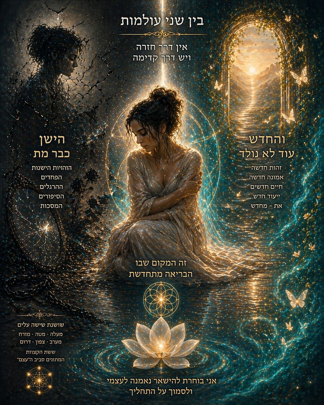 "אל תבהלי מהשקט או מהתחושה שאת כבר לא שם אבל עוד לא כאן. יונג קרא לזה המרחב שבו קורה הקסם. זהו הרגע שבו התודעה שלך מתרחבת כדי שתוכלי להפוך ממי שהיית למי שנועדת להיות. בתוך השקט הזה, ה'עצם' שלך